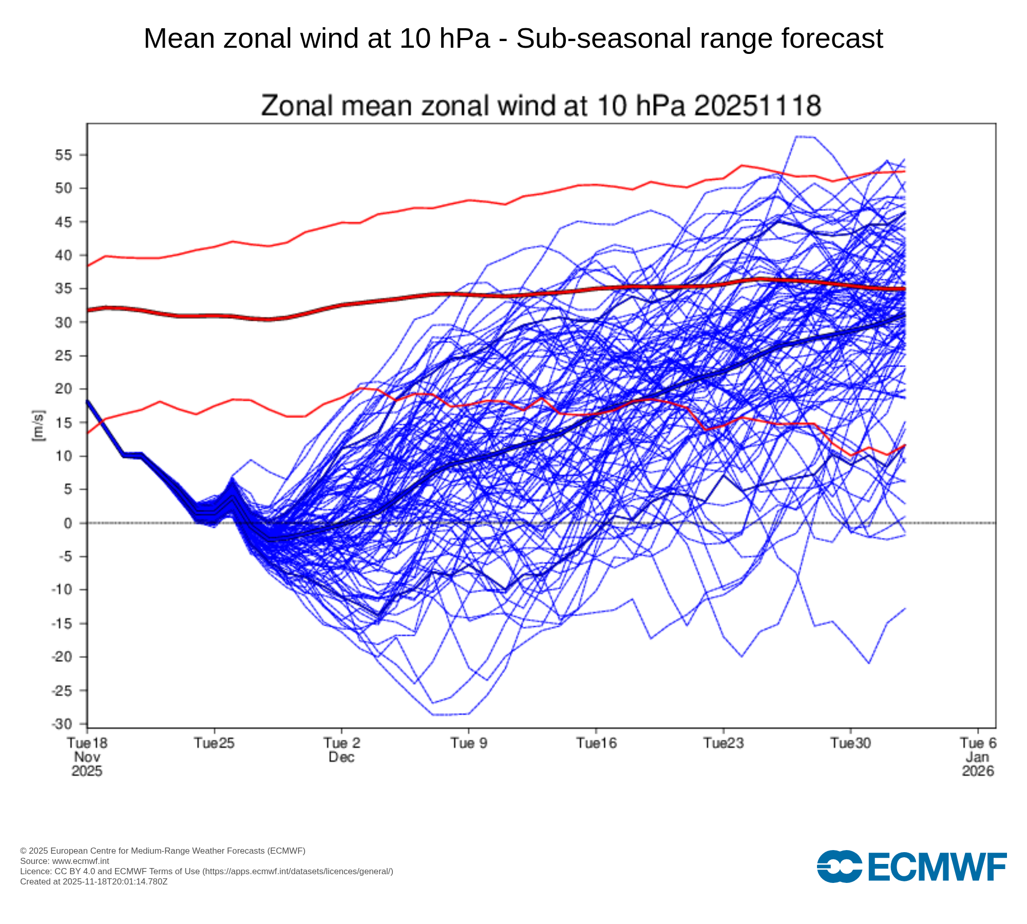 Currently we’re expecting a very weak vortex as we go through December which means it will have little impact on the weather patterns at the surface. A strong polar vortex increases the likelihood of wet and mild weather, equally, a weak vortex can increase the likelihood of colder, drier weather.