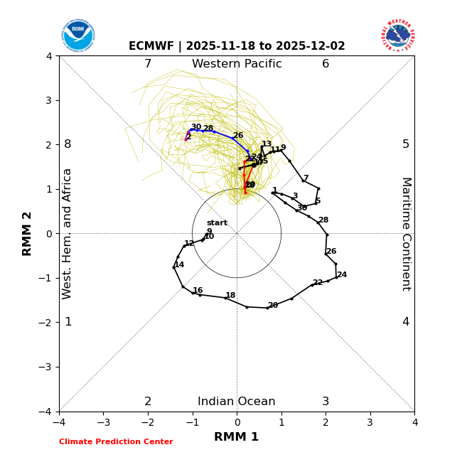 The MJO has been cycling through phases 4, 5 and into 6 over the past few weeks or so and this could have impacts on our weather going into December.